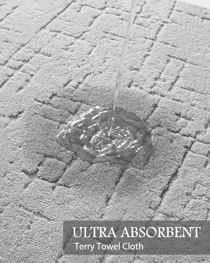 - ABSORBENT & QUICK DRY:Super Absorbent bathroom rug. 100% high-end terry surface, made of extra dense and short fuzzy fibers. Provide twice absorption than normal polyester or polypropylene bathroom mat. Moreover, short fuzzy fibers dry remarkably quickly.Always keep your bathroom clean and tidy.