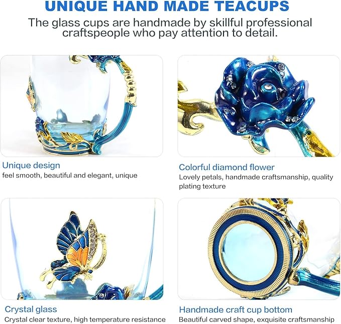 - Fancy Tea Cup:The handmade enamel glass mug has a style with butterfly and blue rose flower designs.No fading as time passed.The visual appeal makes this product for any home,restaurant and office.And the flower tea cup with spoon can be used for hot or cold tea,coffee,milk,juice,soda water and vegetable juice or some other daily uses