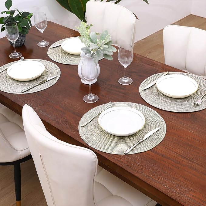 SHACOS Round Braided Placemats Set of 6 Glitter Circle Place Mats Washable 15 inch Table Mats for Dining Table Wedding Party (Light Gray Gold, 6)