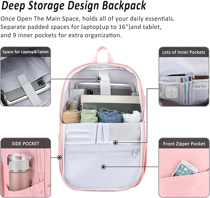 - Deep Storage Backpack for School,Travel and Work --- Open the main space, you can store your daily essentials, such as laptop (Up to 15.6 Inch), tablet, books, pens, power bank and charger. FRONT ZIPPER POCKET and 2 SIDE POCKETS can hold pencil box, water bottles or umbrella. Lots of pockets design make your items organized, say goodbye to dig around in bookbag.(If you have more storage needs or are taller than 5.84 feet, it is recommended to choose MAXTOP 17-inch backpack.)