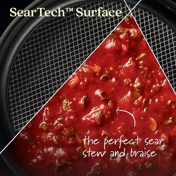 - SEARS LIKE CAST IRON: No other saute pan has it. Exclusive SearTech(tm) technology combines an innovative base and stainless steel mesh engineered to keep oil in the middle of the sauteuse, letting heat and fats unite for incredible caramelization and browning. Create the best flavors without the bulky weight, difficult cleanup, or need for complicated seasoning.