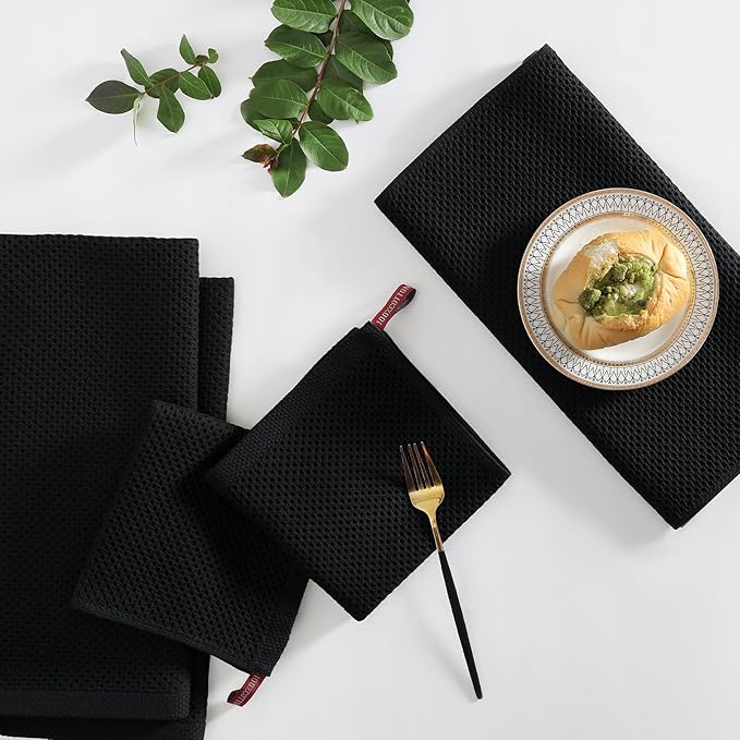 Homaxy 100% Cotton Kitchen Towels and Dishcloths Set, 12 x 12 Inches and 13 x 28 Inches, Set of 8 Bulk Kitchen Towels Set, Ultra Soft Absorbent Dish Cloths for Washing Dishes, Black