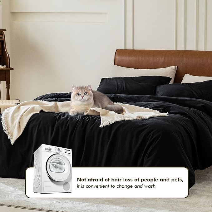 FOSSA Duvet Cover Set 100% Washed Cotton 3 Pieces Bedding Set Twill Soft Cozy Breathable Sturdy Substantial with Textured Weave Solid Black King