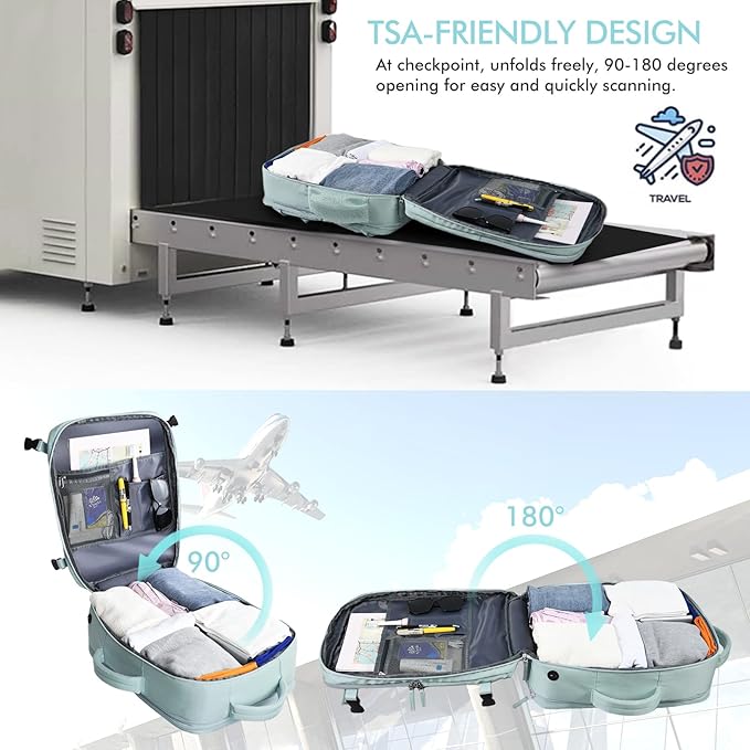 - 【Carry On Backpack for Airplanes】Size of the travel backpack: 44x31x21cm/17.3x12.2x8.3 inches, suitable for placing on the top or under the seat in airlines as personal item. This versatile travel backpack meets the carry on requirements of most airlines, such as Easy Jet, Spirit, Frontier, Jet Blue. The 180 degree zipper closure can help you pass the security check quickly. (Backpack Net Weight : 2.5 LB)