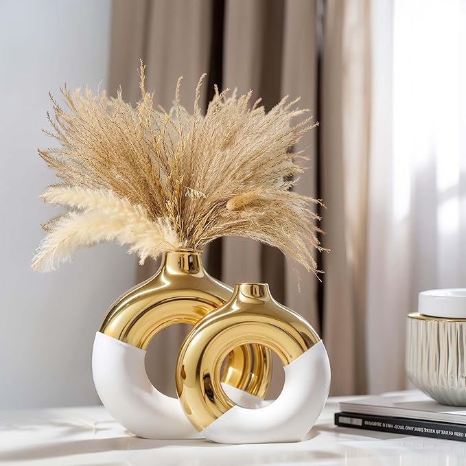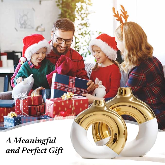 White and Gold Ceramic Vase Set of 2,Round Donut Hollow Flower Vases for Home Decor Accents,Modern Minimalist Centerpiece Table Decorations,Wedding,Living Room,Bookshelf,Office,Entryway