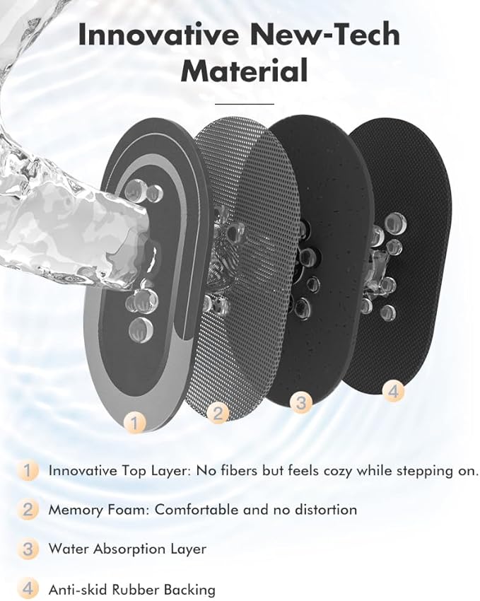 - Super Absorbent & Stain Resistant: Innovative advanced nano porous PU leather surface can absorb dripping water instantly without leaving any watermarks or stains. Super absorbent bath mat in front of bathtub, shower door or sink to keep bathroom floor clean, dry and safe.