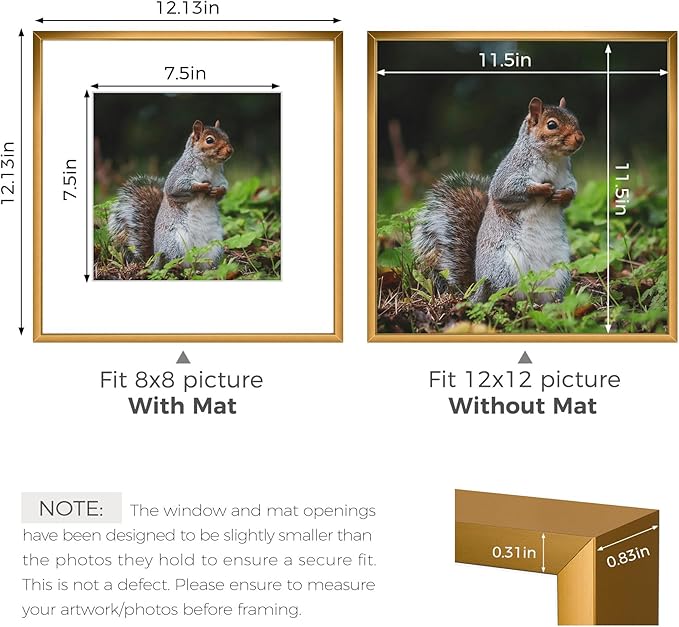 - Can Display:Each 12x12 frame includes a removable Mat (opening size: 7.5"x7.5"), fits for square 8 x 8 picture print (with Mat) or 12 x 12 square poster (without Mat)