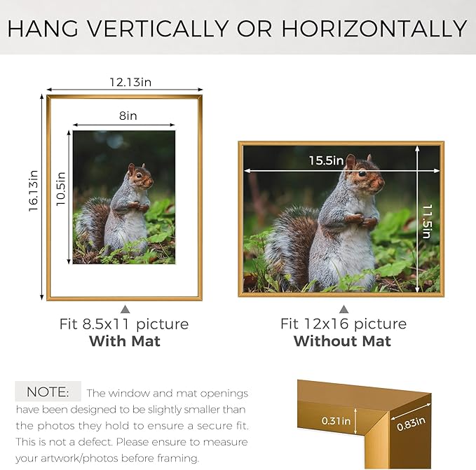 - Can Display:Each 12x16 frame includes a removable Mat (opening size: 8"x10.5"), fits for 8.5 x 11 picture print (with Mat) or 12 x 16 poster (without Mat)