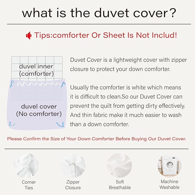 - Zipper Closure:Our 3 pieces microfiber queen duvet cover sets ,the zipper closure allows you to insert and remove your duvet easily when needed. The four corner ties ensure that your comforter remains in place underneath the cover.