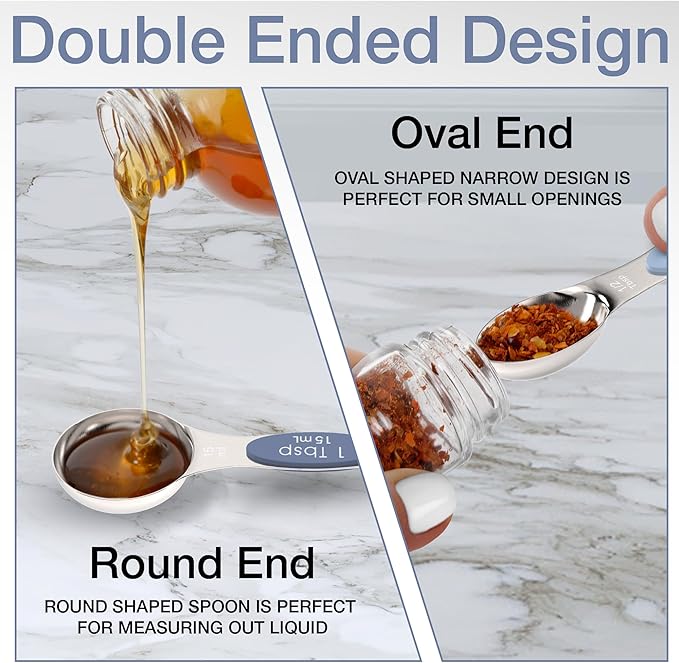- Double Ended: Each spoon in this measuring spoons set stainless steel is dual ended to include a narrow oval end, making them the ideal measuring spoons for spices. Plus, the magnetic measuring spoons set is stackable and nesting for easy storage.