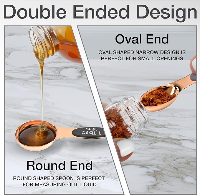 - Double Ended: Each spoon in this measuring spoons set stainless steel is dual ended to include a narrow oval end, making them the ideal measuring spoons for spices. Plus, the magnetic measuring spoons set is stackable and nesting for easy storage.