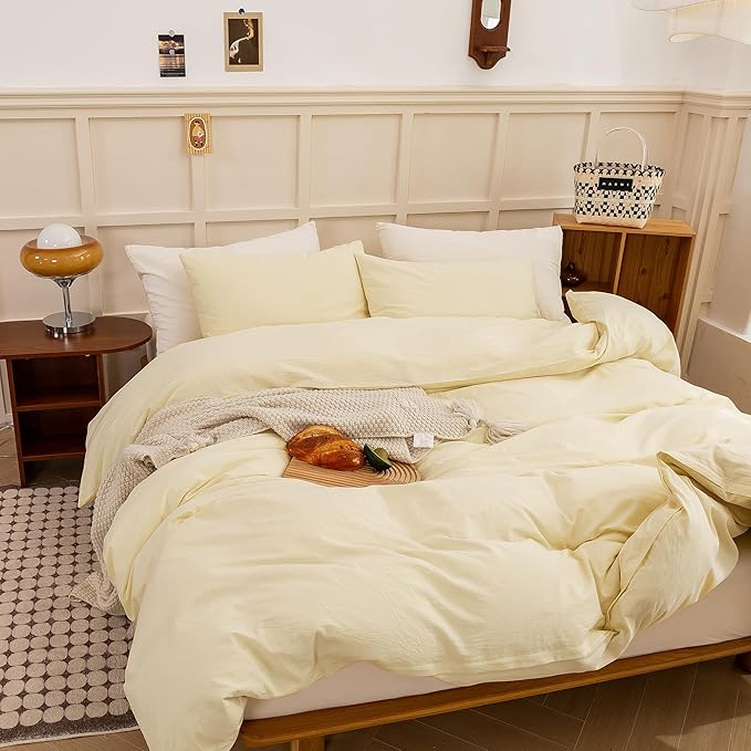 ECOCOTT Duvet Cover Set, 100% Washed Cotton Linen-Like Textured Soft & Breathable, Durable Comfy Bedding Set for All Seasons (Light Yellow, Queen)