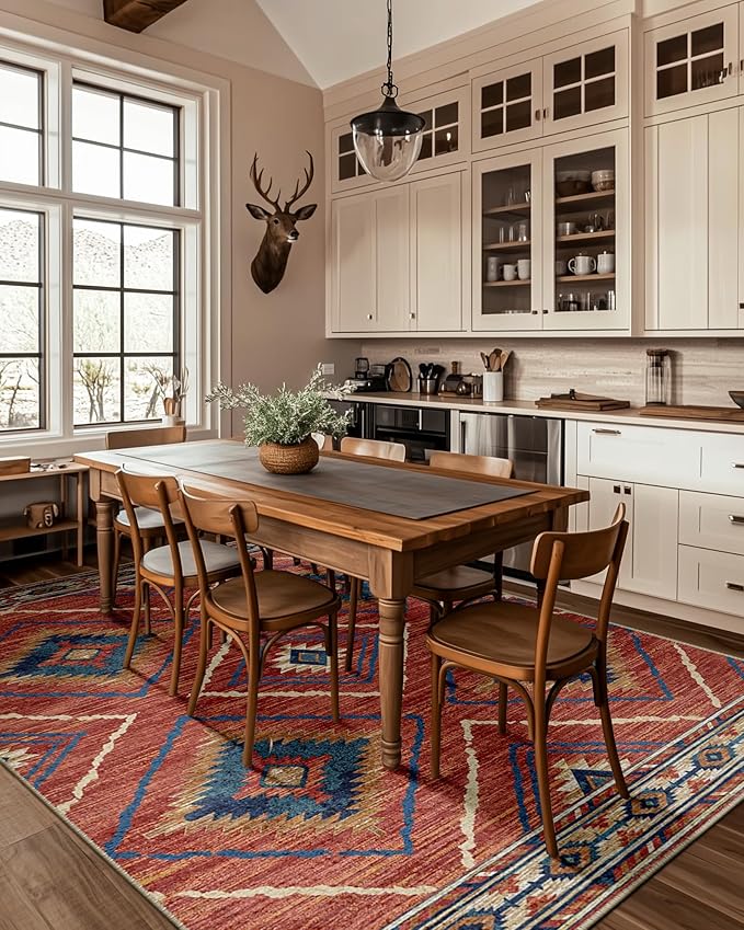 - Tribal Series and Western Style: The Rug patterns feature printed designs that blend tribal and western elements, adding a touch of vintage artistry to your home. The carpets are available in a variety of colors and sizes to suit different living spaces. They are ideal for entryways, foyers, hallways, kitchens, living rooms, dining rooms, and other high-traffic indoor areas. The carpet surface is Water Repellent, and stain-resistant, making it easy to clean.