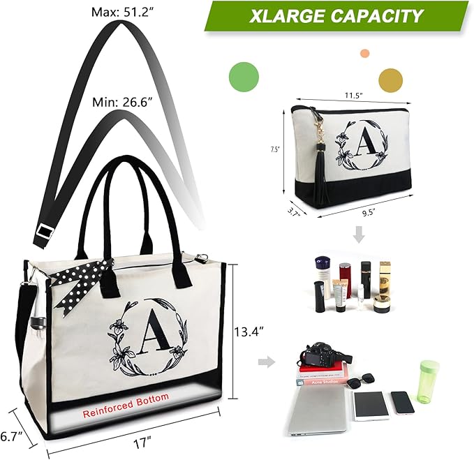 - LARGE SIZE& STURDY: Our large monogram tote bag is made of heavy-duty 100% 13oz canvas.Our monogram tote bags for women is 17 inch wide, 13.4 inch tall, 6.7 inch bottom gusset. Large enough to hold all your daily accessories.The double stitches make our women tote bag strong enough to hold many items without broken. The tote bag is nice for birthday gift, retirement gift for woman, thanksgiving gifts, relaxation gifts, holiday gifts, friend gifts, teacher gifts,thank you gifts.