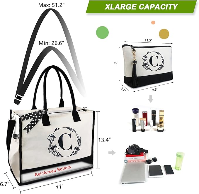 • LARGE SIZE& STURDY: Our large monogram tote bag is made of heavy-duty 100% 13oz canvas.Our monogram tote bags for women is 17 inch wide, 13.4 inch tall, 6.7 inch bottom gusset. Large enough to hold all your daily accessories.The double stitches make our women tote bag strong enough to hold many items without broken. The tote bag is nice for birthday gift, retirement gift for woman, thanksgiving gifts, relaxation gifts, holiday gifts, friend gifts, teacher gifts,thank you gifts.