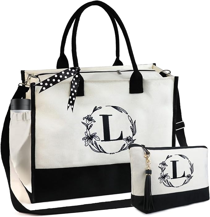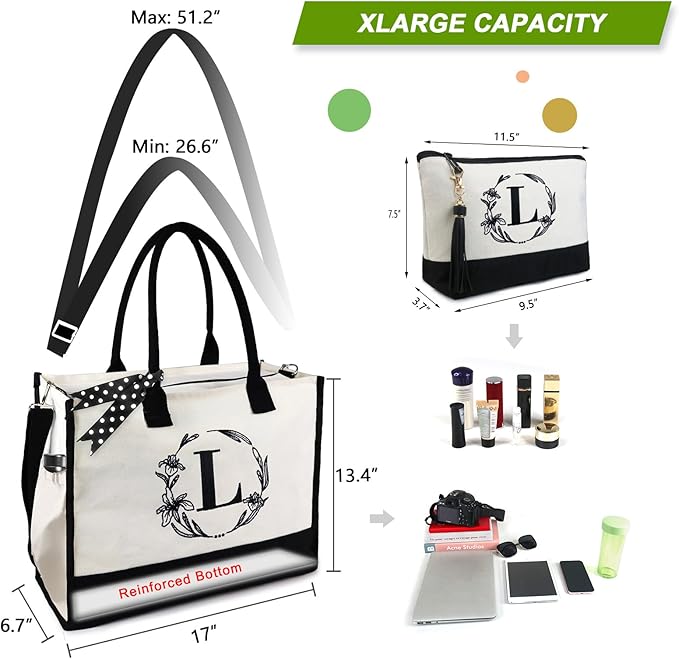 • PERSONALIZED GIFTS & MULTI-USE: The personalized initial tote bag is a unique gift for your mom, sisters, friend, coworkers, teacher, hostess, bride, bridesmaids, employee.When it comes to Valentine's Day,Mother's Day,Teacher's Day. Our monogrammed tote bags makes your gift even more special. You can use this initial tote on many occasions,such as a work bag, travel bag, beach bag, holiday gifts, birthday gift, retirement gift, thank you gifts, relaxation gifts, holiday gifts.