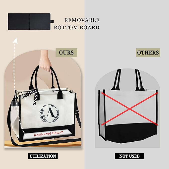 • TOP ZIPPER & REMOVABLE BOARD BOTTOM: This unique gifts bag for woman have 2 pockets, a removable bottom, and adjustable shoulder straps. The side pockets can hold your water bottle. the large initial tote bag also has inner ziper pockets for your phone. The top zipper closure design keeps your items don't fall off. Our woman gifts tote bag with a detachable and adjustable shoulder strap.This canvas tote bag is an excellent beach bag, wedding bag, work tote bag, travel bag, inspirational gifts.