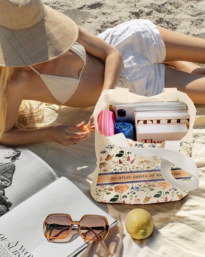 - Perfect Size and Suitable for Various Occasions: Measuring at 15*17*0.4 inch, this large capacity canvas tote bag aesthetic has a casual and versatile style, making it ideal for various occasions. It has enough room to store all your essentials, including books, laptops, tablets, and more. Whether you're traveling, going to the beach, studying in the library, working, shopping, exercising, going out for leisure, or grocery storage, this cute reusable cotton canvas bag can meet your needs.