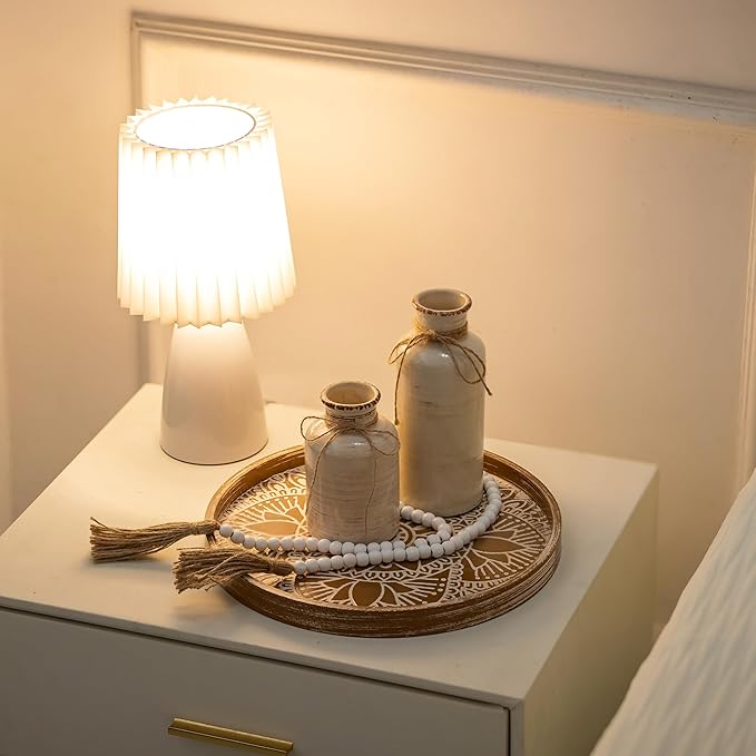 Hanobe Round Decorative Tray for Centerpiece: 2Pcs Vintage Coffee Table Trays with Boho Bead Garlandfor Home Decor - Farmhouse Wood Serving Platter Circle for Kitchen Counter Women