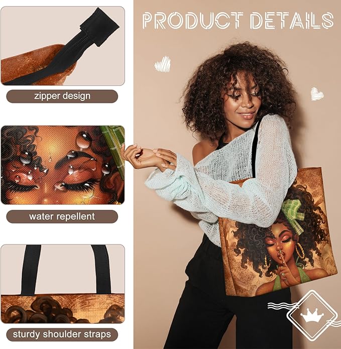 African American Women Tote Bag Black Shoulder Handbag For Women Fit Work Beach Labtops With Zip