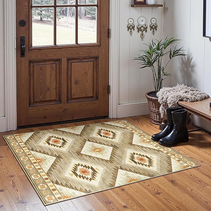 Area Rug 2x3 Rug Machine Washable Non-Slip Low Pile Print Pattern Western Rug for Living Room Bedroom Entryway Tribal Series -Cream/Camel