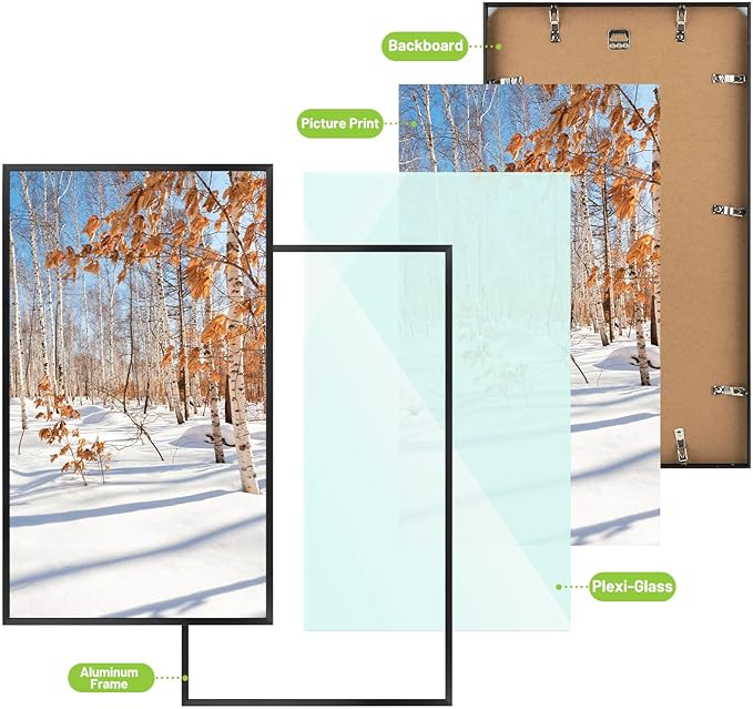 - Material: Brush Black Aluminum Finish Frame with Plexiglass Front, That Gives a Clear View of Your Pictures, Preserve Your Artwork For a Long Time