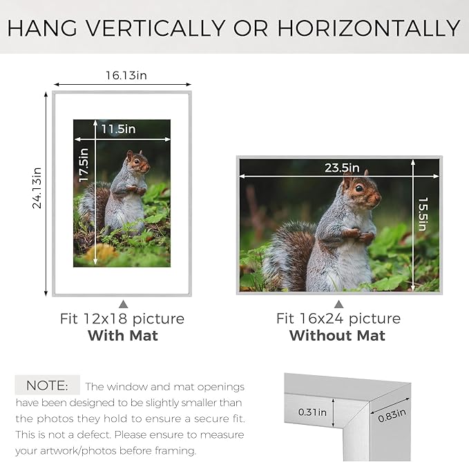 - Can Display:Each 16x24 frame includes a removable Mat (opening size: 11.5"x17.5"), fits for 12 x 18 picture print (with Mat) or 16 x 24 poster (without Mat)
