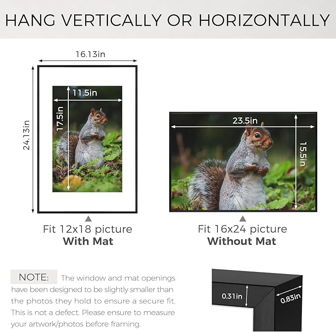 - Can Display:Each 16x24 frame includes a removable Mat (opening size: 11.5"x17.5"), fits for 12 x 18 picture print (with Mat) or 16 x 24 poster (without Mat)