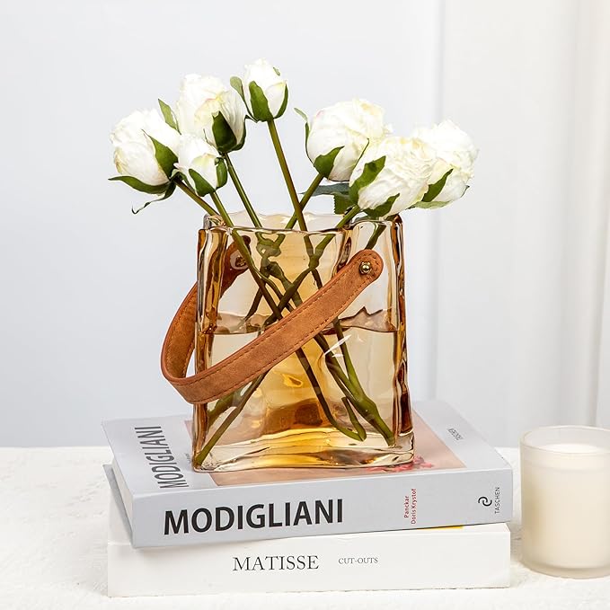 - Purse Vase for Flowers - Fired at high temperature and hand blown, this clear flower vase features in lady's handbag shape, with retro handle, shows a natural pleated texture. Differing from traditional flower vases, this small vases combines practicality with aesthetic design, making it more aesthetically pleasing and modern art