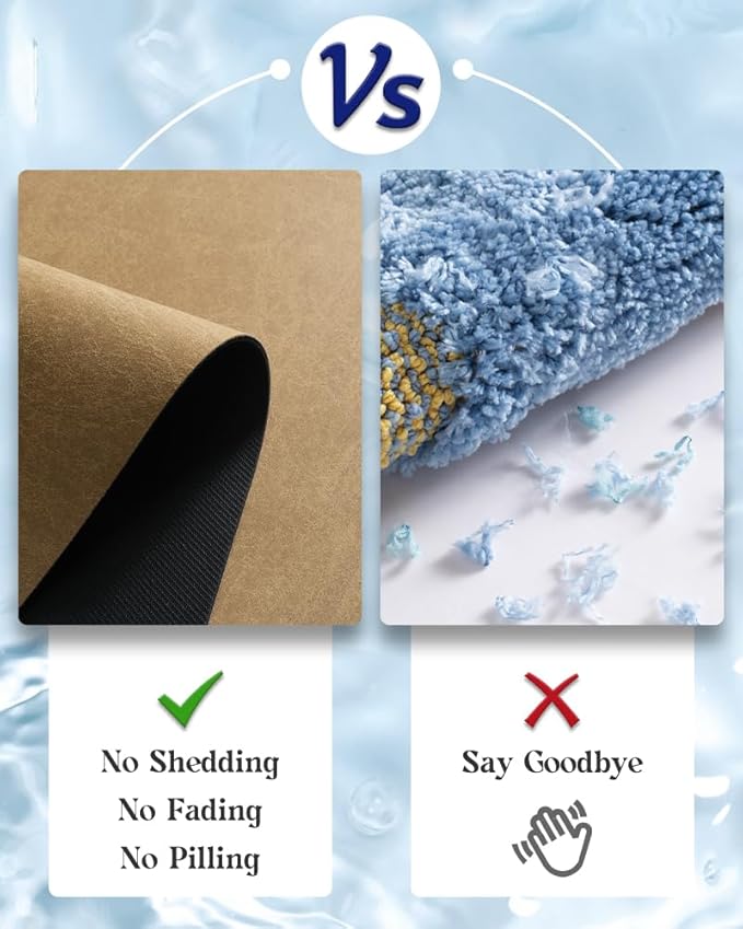 - DURABLE:These bathroom mats are designed with a Faux suede surface. You will never be bothered by fiber dropping or fuzzy pilling problems like traditional chenille bathroom floor mats. Therefore, this bath rug is much more durable without problems caused by fibers, like shedding, fading, wearing, dirt or hair hiding