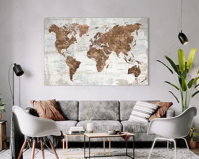 Large Wall Art Vintage Brown World Map Canvas Pictures for Men Home Office Bedroom Wall Decor for Living Room Oversize Artwork