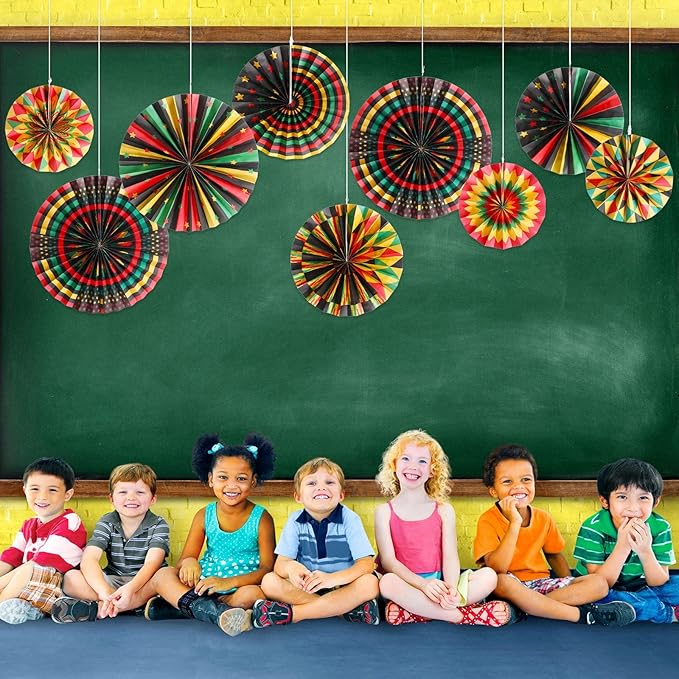 - Kente Paper Fans Size: there are 3 different sizes of black history month hanging fans for you to choose, 8 inch, 12 inch, 16 inch, 9 pieces of each size, the proper size for kente classroom bulletin board decorations, Juneteenth decorations for outdoor, kente graduation party decorations