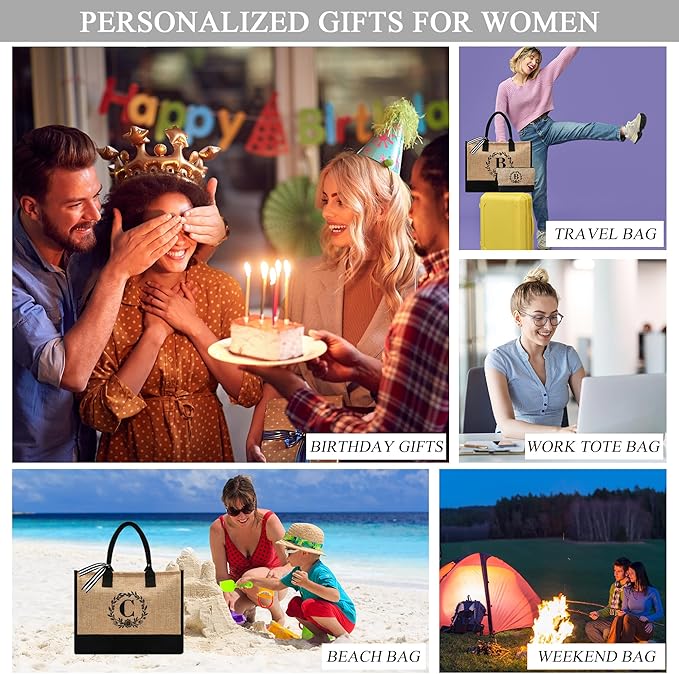 - PERSONALIZED GIFTS & MULTI-USE: The personalized initial tote bag is a unique gift for your mom, sisters, friend, coworkers, teacher, hostess, bride, bridesmaids, employee.When it comes to Valentine's Day,Mother's Day,Teacher's Day. Our monogrammed tote bags makes your gift even more special. You can use this initial tote on many occasions,such as a work bag, travel bag, beach bag, holiday gifts, birthday gift, retirement gift, thank you gifts, relaxation gifts, holiday gifts.