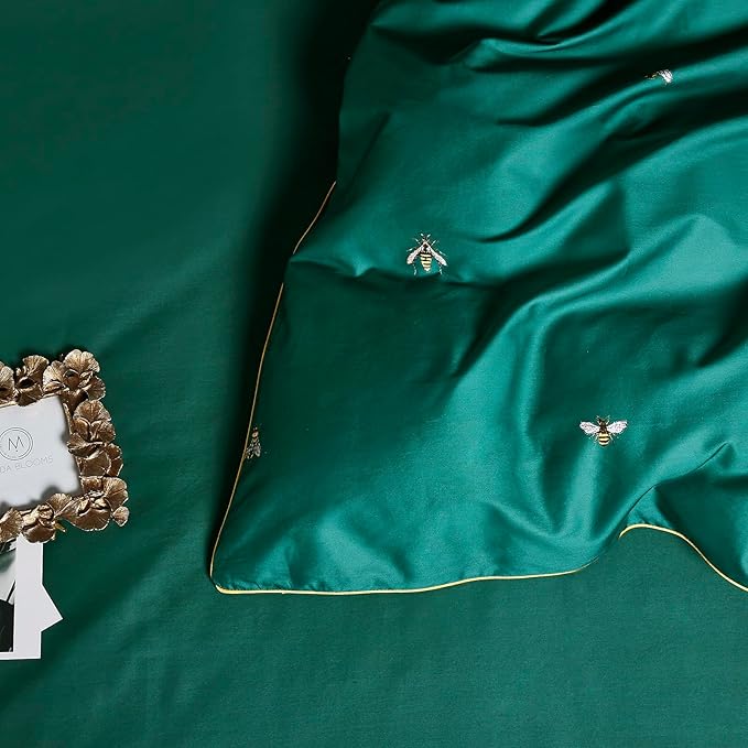 mixinni Dark Green Duvet Cover Queen Size, 100% Long Staple Cotton Honeybee Floral Pattern 3pc Bedding Duvet Cover Set with Zipper Ties 2 Pillowcases Perfect for Him and Her-Queen Size