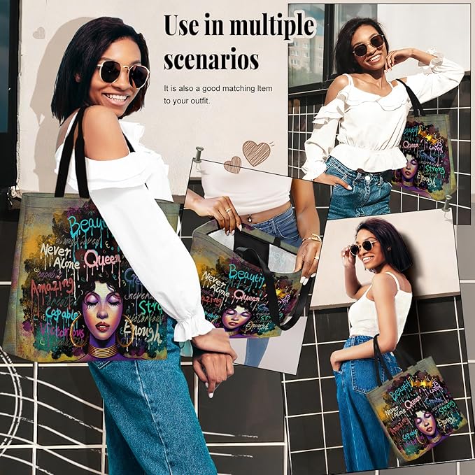 African American Women Tote Bag Black Shoulder Handbag For Women Fit Work Beach Labtops With Zip
