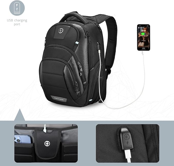 - 【INTEGRATED USB CHARGING PORT】: Equipped with a USB charging port, This black backpack offers quick access to charge your electronic devices such as smartphones, tablets, Kindles, and all other USB devices on the go while using them at the same time. Note: A power bank is not included. No special power bank is required