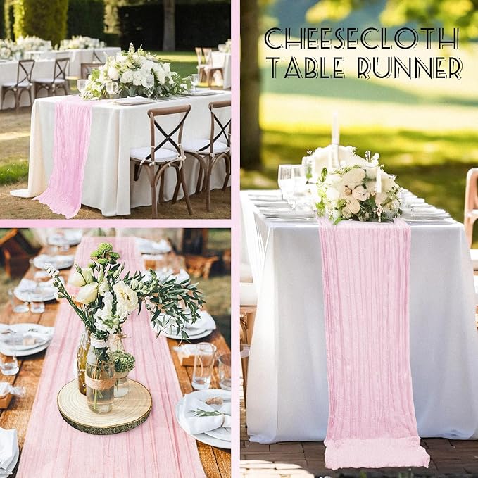 - Multipurpose Table Runner: This pink cheesecloth table runner features a gorgeous folded edge design for an elegant look and creates a vintage home decor look. Great for wedding decorations, country weddings, birthday parties, dinner parties, Valentine's Day, Thanksgiving, Christmas and other celebratory occasions. The tablecloth is not easy to warp or fade, no ironing is needed to keep the pleated texture, please feel free to wash and use it again and again.