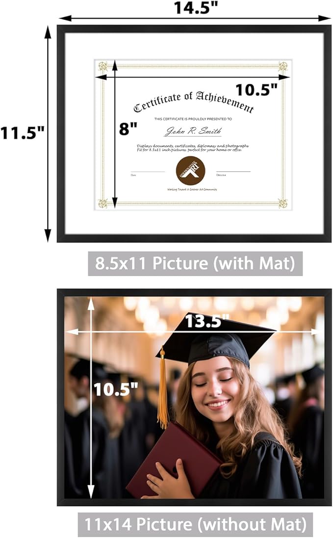 - Can Display:Each 14x11 frame includes a removable Mat (opening size: 8"x10.5"), fits for 8.5 x 11 document (with Mat) or 11 x 14 poster (without Mat)