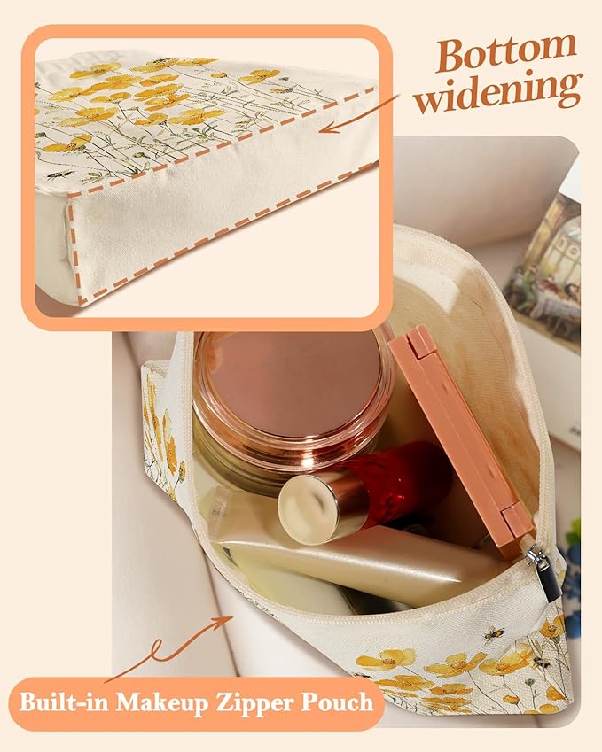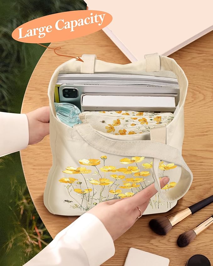 - Two Canvas Bags Set: The combination of a large tote bag measuring at 14*15 inch(the handles 11 inch) and a cosmetic makeup zipper pouch bag(6*8.5inch) make it easier to organize daily personal effects. The zipper design of the small organizer bag won't let lipstick, blush, keys, earphones, paper towels and other small items fall out.