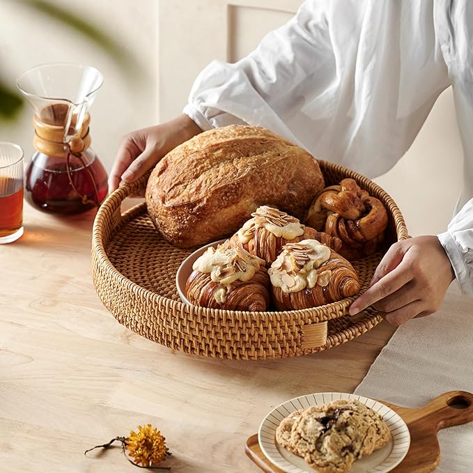 - ⭐️ VERSATILE & STYLISH: With a generous ~14-inch diameter (34.5 cm x 6.5 cm), this elegant table basket tray is perfect for serving food, coffee, desserts, or as a centerpiece to display decor. Its timeless circle design—available in chestnut brown, whitewash, or natural honey—adds a touch of natural farmhouse elegance to any home, making it a thoughtful gift for any occasion.