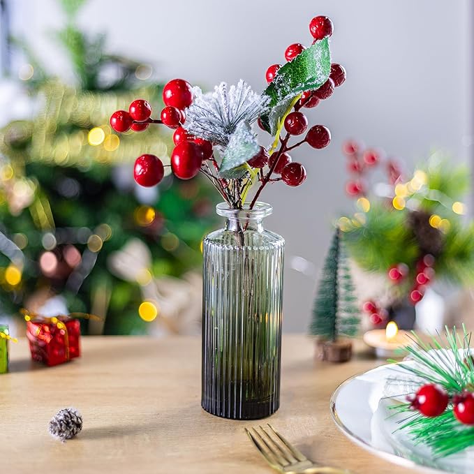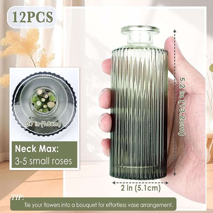 Green Glass Bud Vases Set of 12, Mini Ribbed Flower Vase for Centerpieces, Small Glass Vases in Bulk for Wedding Decorations, Vintage Vase for Table, Housewarming Gift, Home Décor