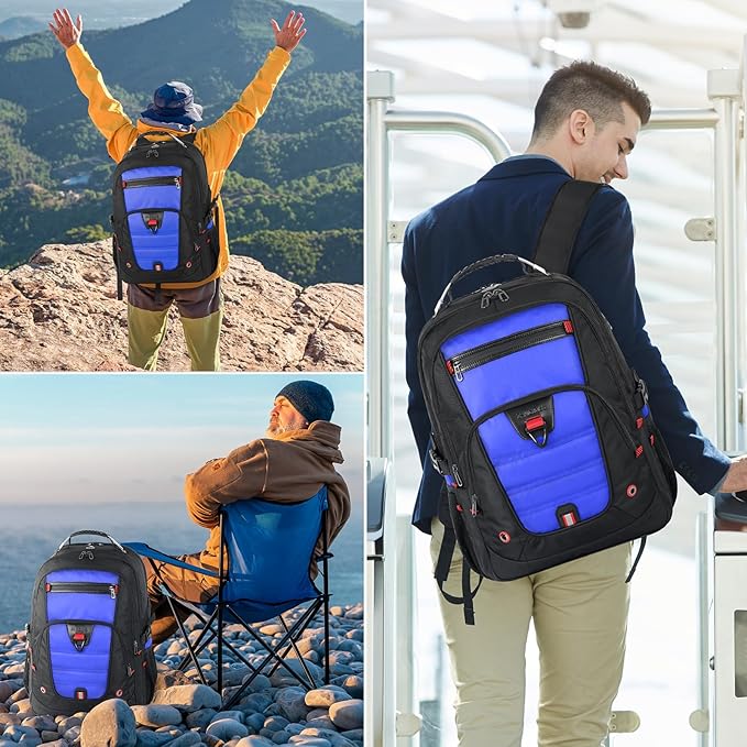 - 【Multi-Pockets】: Our waterproof laptop bag backpack has 3 spacious compartments and 18+ pockets which can provide roomy space for your computer, notebook, iPads, power bank, passport, wallet, clothes and more items. Functional front pocket has many small pockets. The personal item travel bag has a sturdy handle on top. A hole in the big travel backpack is used for the outside of the earphone. As a backpack for men women/travel carry on backpack/airlines personal item bag, you will enjoy it