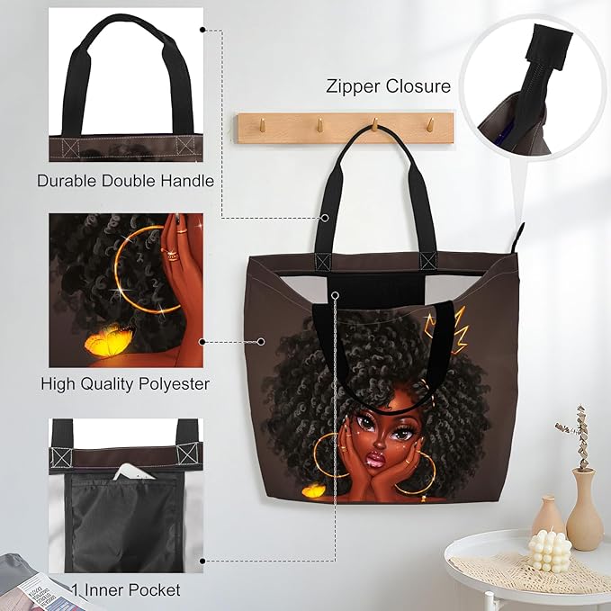 African American Women Tote Bag Black Shoulder Handbag For Women Fit Work Beach Labtops With Zip