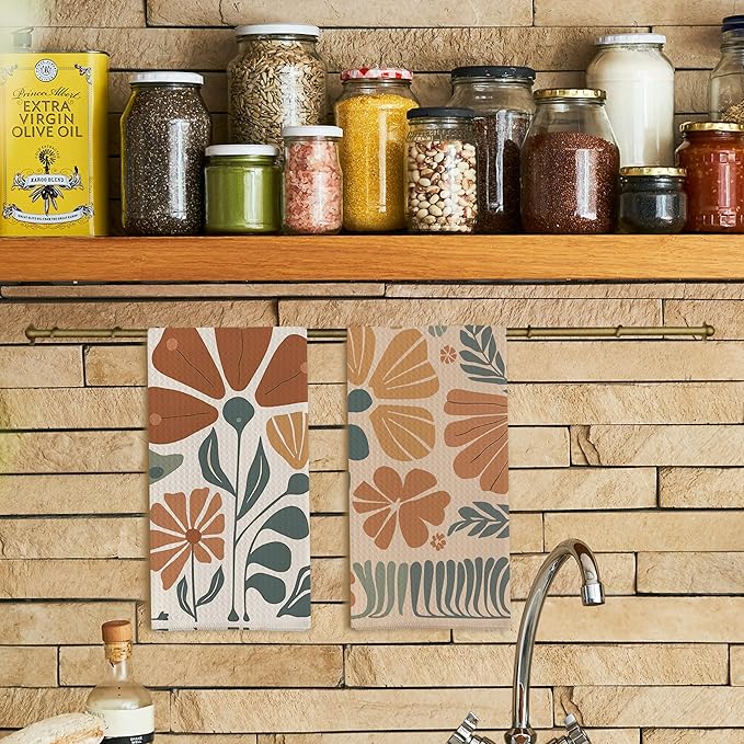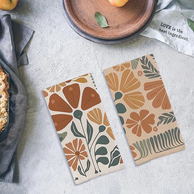 Abstract Boho Floral Kitchen Towels Set of 2, 70s Retro Groovy Dish Towels for Kitchen, Vintage Boho Hand Towels for Bathroom, 16x24 Inches