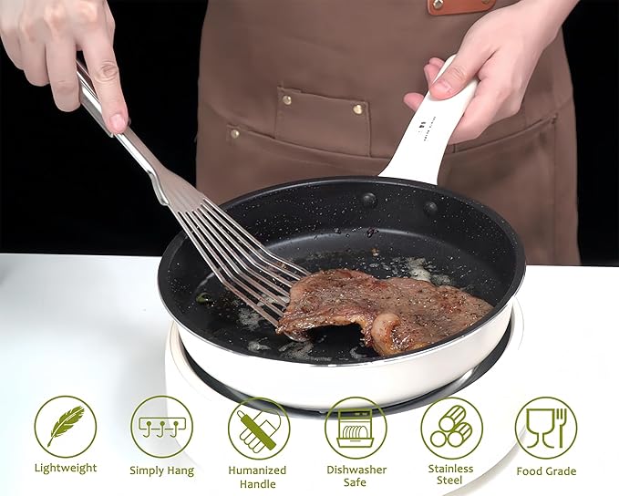 - 🍳【12 pcs Kitchen Utensils Set with Holder】Our cooking utensils set stainless steel is a economic set for cooking and baking. This kitchen utensils set contains total 12pcs different kitchen tools such as 1x slotted spoon, 1x solid spoon, 1x ladle, 1x slotted turner, 1x solid turner, 1x Fish Spatula, 1x skimmer, 1x Potato Masher, 1x whisk, 1x tongs, 1x Pasta Server. Besides, it also comes with a utensils holder to storage all tools.