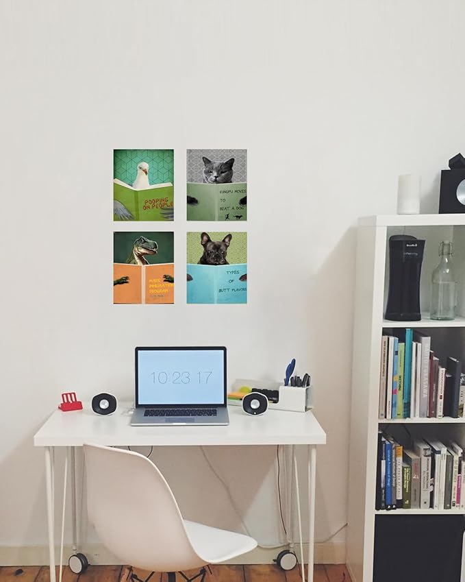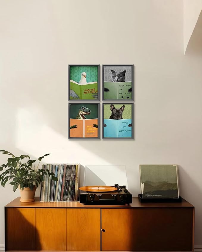- Bathroom Decor Wall Art (Wall Decor Aesthetic): This set of unframed bathroom artwork for walls combines 4 animals pictures reading book. This animal reading book bathroom pictures set can add a funny and humor atmosphere to your bathroom, restroom or guest bathroom or other room, making your home more unique and distinctive. This inspirational bathroom wall decor set will complement any interior design.