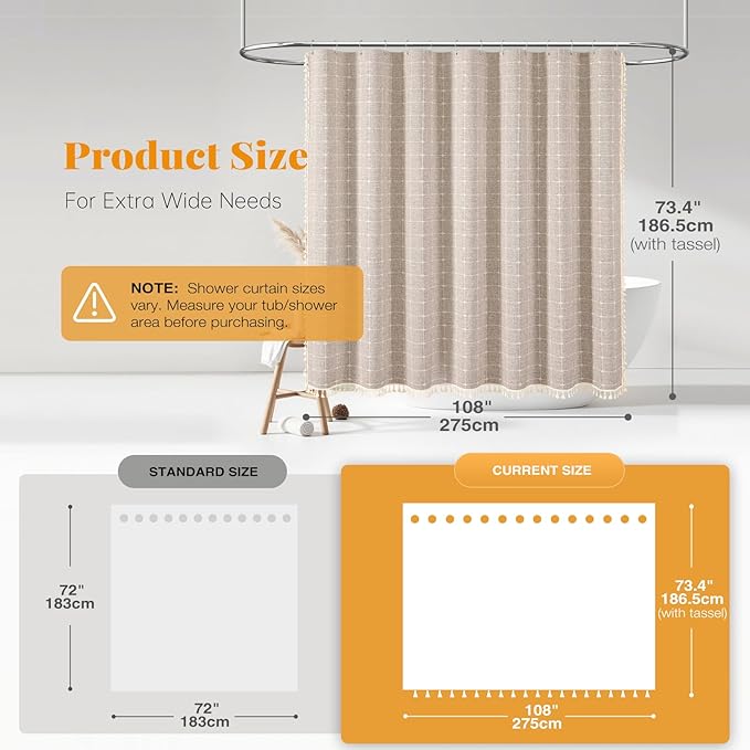 - 🛁【Dimensions】: W108xH72 inches(The tassel length is not included); ❤️The tassel brings 1.4 inches of additional length❤️; Package includes 1 tan/taupe shower curtain and ★18 Plastic Hooks★; Various sizes shower curtains meet most bathtubs and shower stalls need. This farmhouse shower curtain is perfect for apartment, hotel, spa, camper, RV, dorm, school shower, athletic club, gym and everywhere else you need a shower curtain.