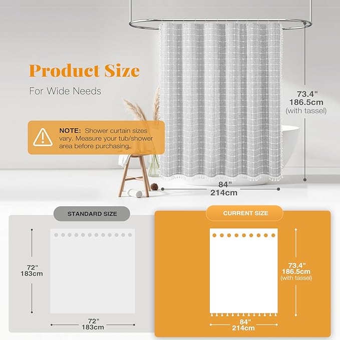 - 🛁【Dimensions】: W84xH72 inches(The tassel length is not included); ❤️The tassel brings 1.4 inches of additional length❤️; Package includes 1 grey/gray shower curtain and ★14 Plastic Hooks★; Various sizes shower curtains meet most bathtubs and shower stalls need. This farmhouse shower curtain is perfect for apartment, hotel, spa, camper, RV, dorm, school shower, athletic club, gym and everywhere else you need a shower curtain.