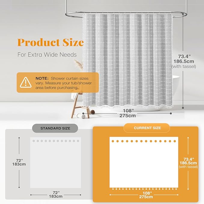 - 🛁【Dimensions】: W108xH72 inches(The tassel length is not included); ❤️The tassel brings 1.4 inches of additional length❤️; Package includes 1 grey/gray shower curtain and ★18 Plastic Hooks★; Various sizes shower curtains meet most bathtubs and shower stalls need. This farmhouse shower curtain is perfect for apartment, hotel, spa, camper, RV, dorm, school shower, athletic club, gym and everywhere else you need a shower curtain.
