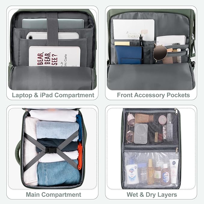 - Easier Packing: Features with 180 degree opening and enough depth of the interior space, this traveling backpack enables you to pack it almost like a suitcase. And the side buckles will be helpful to compress the backpack when you overpack it
